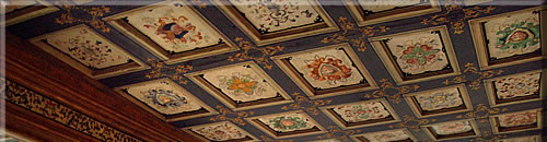Festsaal mit Flügel, Kassettendecke mit Balken und Kassettenbild